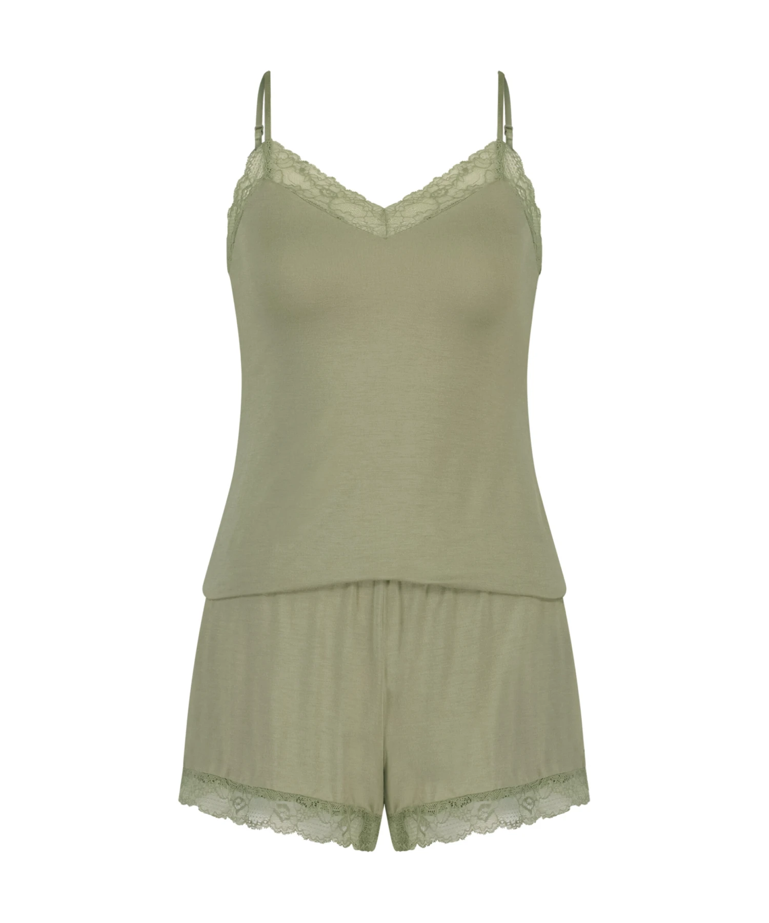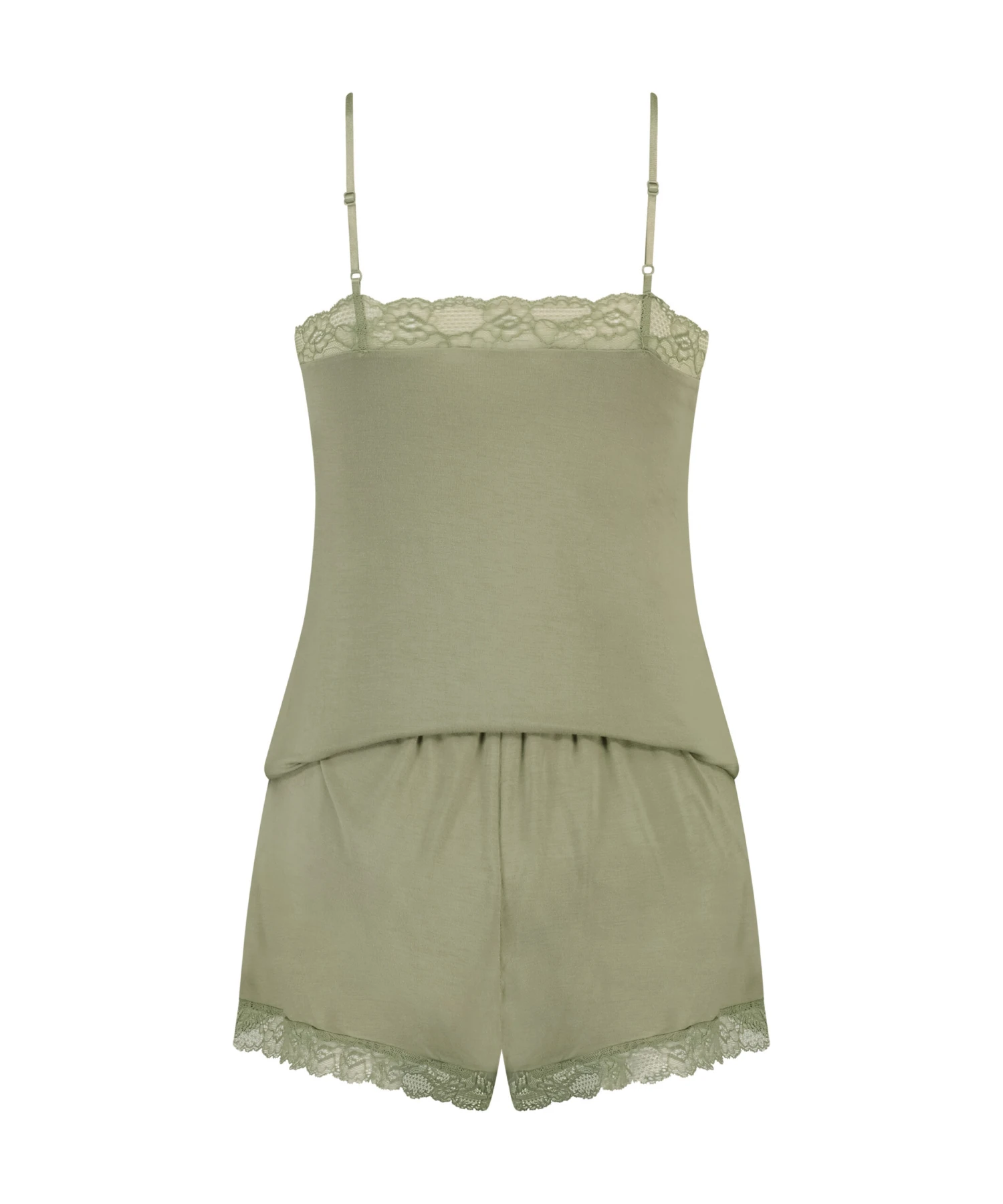 In diesem bequemen Pyjama-Set wirst Du gut schlafen können! Der Pyjama ist mit hübschen Spitzendetails verziert. Kombiniere ihn mit einem schönen Kimono oder Bademantel für das perfekte Wohlfühl-Outfit!